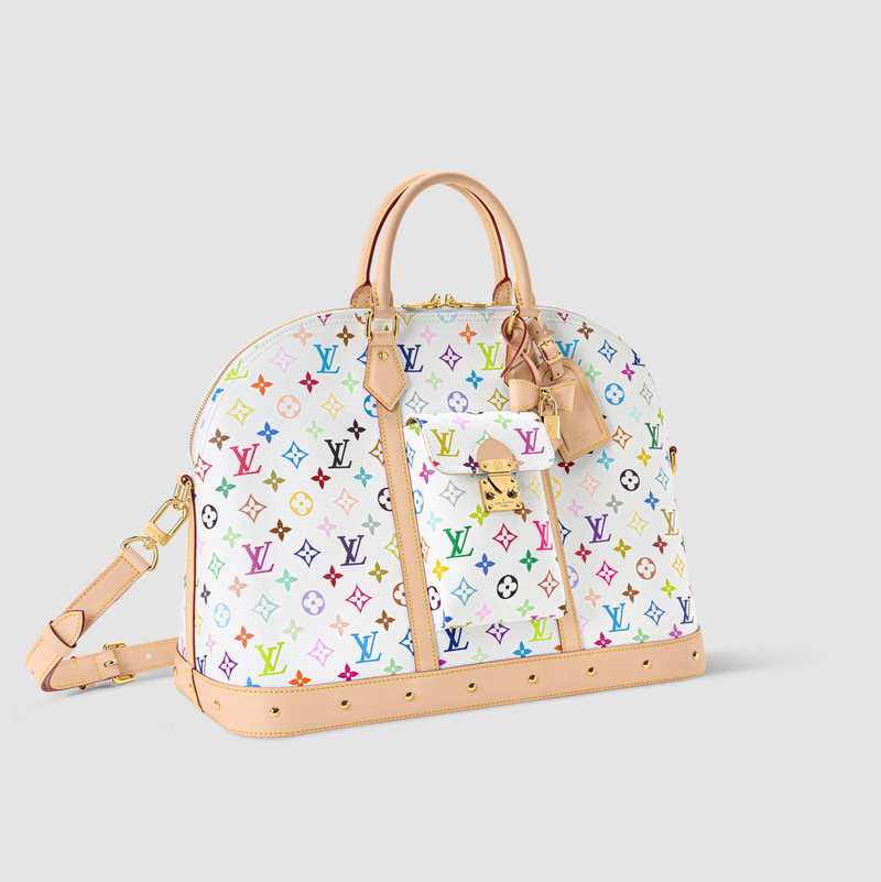 Characteristics:The Alma Travel bag’s distinctive silhouette embraces a pop-art spirit in Monogram Multicolore coated canvas. Originally created by Takashi Murakami for the House in 2003, this multihued variation on the Monogram motif includes 33 distinct colors. Lined in cream-colored microfiber, it’s finished with natural cowhide trim and golden hardware, including riveted accents.
